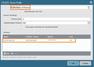 1. Create a TACACS server profile and an Authentication profile.